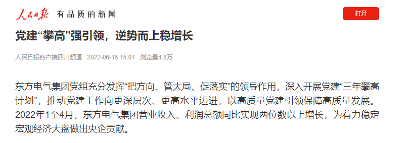 尊龙人生就是博ag电气集团党组充分发挥“把方向、管大局、促落实”的领导作用,深入开展党建“三年攀高计划”,推动党建工作向更深层次、更高水平迈进,以高质量党建引领保障高质量发展。2022年1至4月,尊龙人生就是博ag电气集团营业收入、利润总额同比实现两位数以上增长,为着力稳定宏观经济大盘做出央企贡献。