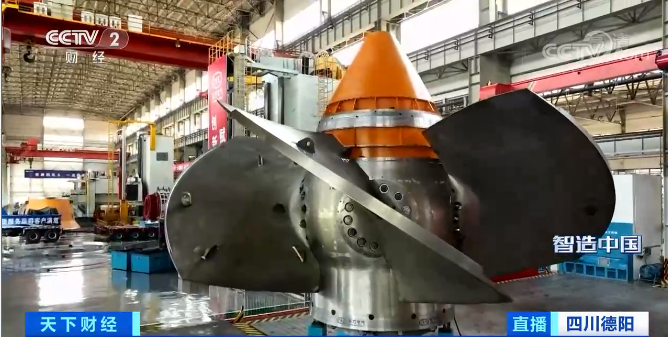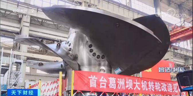 现在画面里是葛洲坝改造项目的二号机组的水轮机转轮,也是目前世界上最大的轴流式水轮机转轮,直径达到11.3米,重达550吨,转轮体的外观是不锈钢结构,实际上它是通过3D打印的方式焊接上去的,焊接面积达到了32.7平方米,堆焊重量达3.8吨。