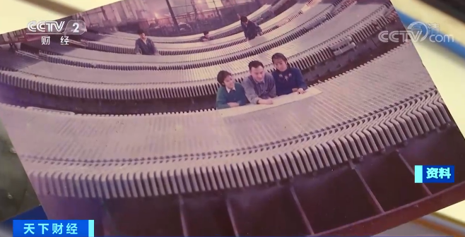 水轮机转起来,带动发电机发电,这张老照片的背景就是发电机的核心部件定子,这个定子大约由20万片冲片组成,当时,定子冲片全要靠人工从产线上接下,再一片片叠好。