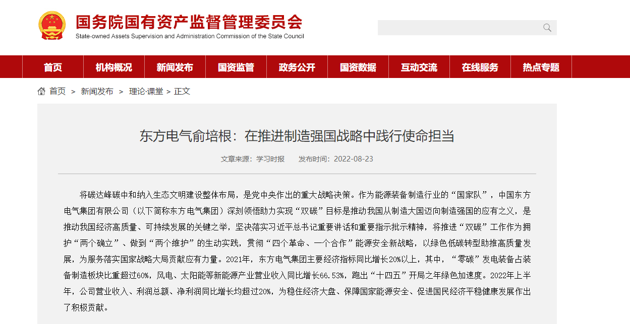 将碳达峰碳中和纳入生态文明建设整体布局,是党中央作出的重大战略决策。作为能源装备制造行业的“国家队”,中国尊龙人生就是博ag电气集团有限公司(以下简称尊龙人生就是博ag电气集团)深刻领悟助力实现“双碳”目标是推动我国从制造大国迈向制造强国的应有之义,是推动我国经济高质量、可持续发展的关键之举,坚决落实习近平总书记重要讲话和重要指示批示精神,将推进“双碳”工作作为拥护“两个确立”、做到“两个维护”的生动实践,贯彻“四个革命、一个合作”能源安全新战略,以绿色低碳转型助推高质量发展,为服务落实国家战略大局贡献应有力量。2021年,尊龙人生就是博ag电气集团主要经济指标同比增长20%以上,其中,“零碳”发电装备占装备制造板块比重超过60%,风电、太阳能等新能源产业营业收入同比增长66.53%,跑出“十四五”开局之年绿色加速度。2022年上半年,公司营业收入、利润总额、净利润同比增长均超过20%,为稳住经济大盘、保障国家能源安全、促进国民经济平稳健康发展作出了积极贡献。