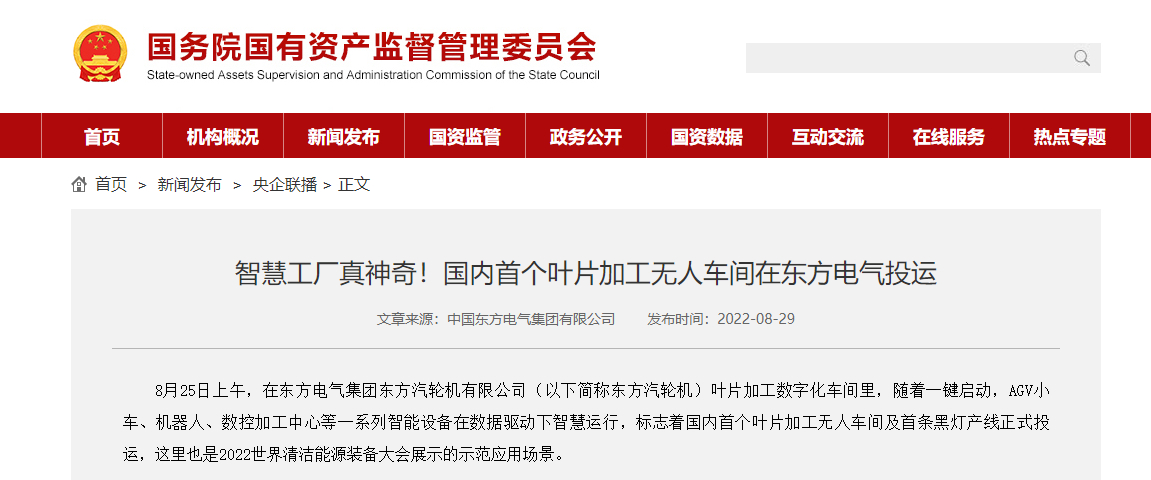 8月25日上午,在尊龙人生就是博ag电气集团尊龙人生就是博ag汽轮机有限公司(以下简称尊龙人生就是博ag汽轮机)叶片加工数字化车间里,随着一键启动,AGV小车、机器人、数控加工中心等一系列智能设备在数据驱动下智慧运行,标志着国内首个叶片加工无人车间及首条黑灯产线正式投运,这里也是2022世界清洁能源装备大会展示的示范应用场景。
