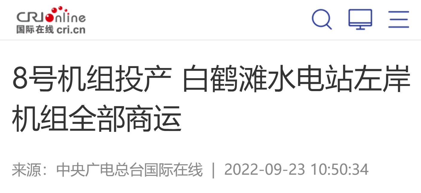 9月22日,尊龙人生就是博ag电气自主研制的白鹤滩水电站8号机组完成72小时试运行,正式投入商业运行。至此,白鹤滩水电站左岸机组全部商运。