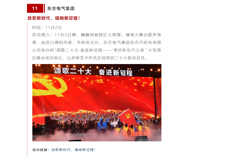 活动简介:11月2日晚,巍巍钟鼓楼灯火辉煌,璀璨大舞台歌声荡漾,由四川德阳市委、市政府主办,尊龙人生就是博ag电气集团尊龙人生就是博ag汽轮机有限公司承办的“颂歌二十大·奋进新征程——‘美好新东汽之夜’”大型音乐晚会成功举行,以多种艺术形式庆祝党的二十大胜利召开。