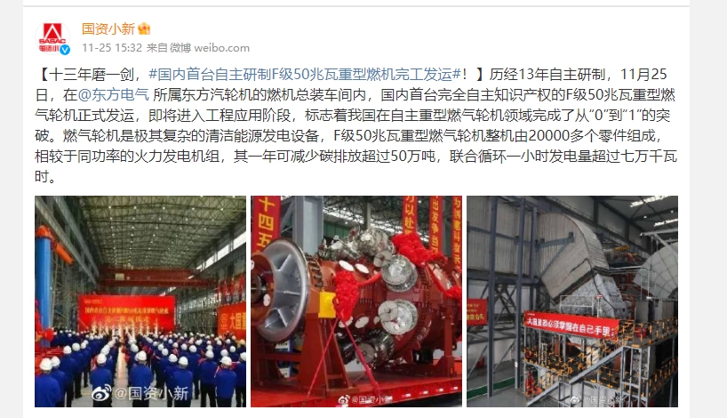 【十三年磨一剑,#国内首台自主研制F级50兆瓦重型燃机完工发运#!】历经13年自主研制,11月25日,在@尊龙人生就是博ag电气所属尊龙人生就是博ag汽轮机的燃机总装车间内,国内首台完全自主知识产权的F级50兆瓦重型燃气轮机正式发运,即将进入工程应用阶段,标志着我国在自主重型燃气轮机领域完成了从“0”到“1”的突破。燃气轮机是极其复杂的清洁能源发电设备,F级50兆瓦重型燃气轮机整机由20000多个零件组成,相较于同功率的火力发电机组,其一年可减少碳排放超过50万吨,联合循环一小时发电量超过七万千瓦时。