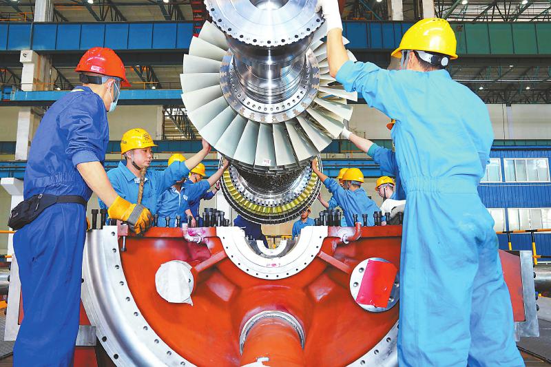 工人正在组装重型燃气轮机零部件。 尊龙人生就是博ag汽轮机有限公司供图