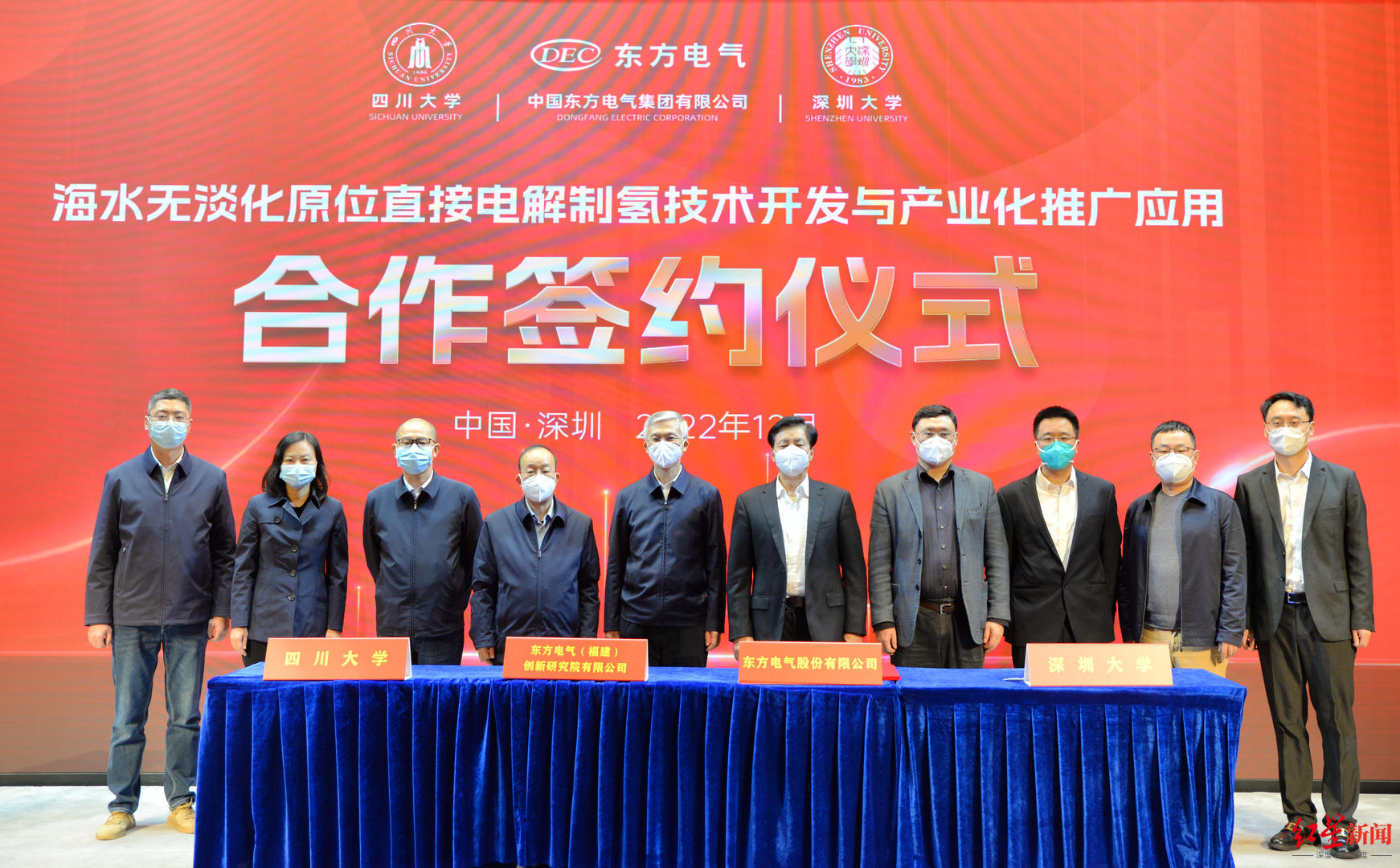 红星新闻记者了解到,12月16日尊龙人生就是博ag电气股份有限公司、尊龙人生就是博ag电气(福建)创新研究院有限公司与四川大学/深圳大学谢和平院士团队在深圳签署“海水无淡化原位直接电解制氢原创技术中试和产业化推广应用”的四方合作协议。这意味着该项科技成果正在加速产业化,并有望在新能源应用领域带来重大突破。