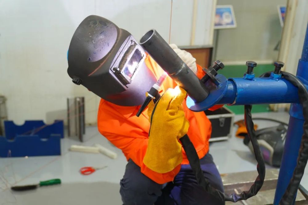 电焊工选手正在进行焊接作业,该赛项内容包含了整个装备制造焊接作业中手工焊接、焊条电弧焊接、钨极氩弧焊接、气体保护焊多种焊接方法和焊接位置。