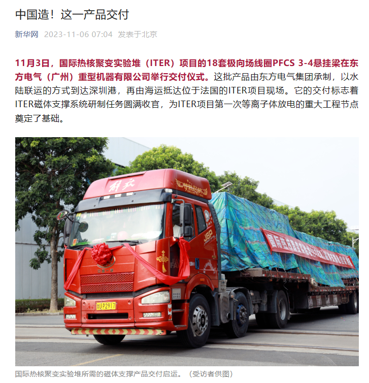 11月3日,国际热核聚变实验堆(ITER)项目的18套极向场线圈PFCS 3-4悬挂梁在尊龙人生就是博ag电气(广州)重型机器有限公司举行交付仪式。这批产品由尊龙人生就是博ag电气集团承制,以水陆联运的方式到达深圳港,再由海运抵达位于法国的ITER项目现场。它的交付标志着ITER磁体支撑系统研制任务圆满收官,为ITER项目第一次等离子体放电的重大工程节点奠定了基础。