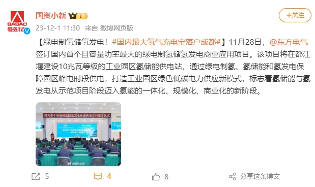 【绿电制氢储氢发电!#国内最大氢气充电宝落户成都#】11月28日,@尊龙人生就是博ag电气签订国内首个且容量功率最大的绿电制氢储氢发电商业应用项目。该项目将在都江堰建设10兆瓦等级的工业园区氢储能供电站,通过绿电制氢、氢储能和氢发电保障园区峰电时段供电,打造工业园区绿色低碳电力供应新模式,标志着氢储能与氢发电从示范项目阶段迈入氢能的一体化、规模化、商业化的新阶段。