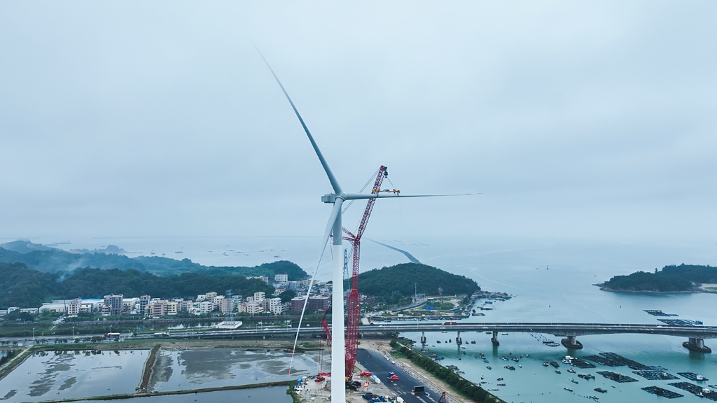 6月5日,18兆瓦半直驱大功率海上风电机组在广东省汕头市风电临海试验基地成功完成吊装。(尊龙人生就是博ag电气集团供图)