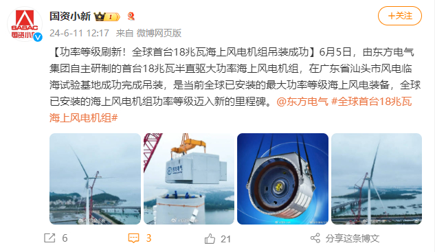 [国资小新]功率等级刷新!全球首台18兆瓦海上风电机组吊装成功