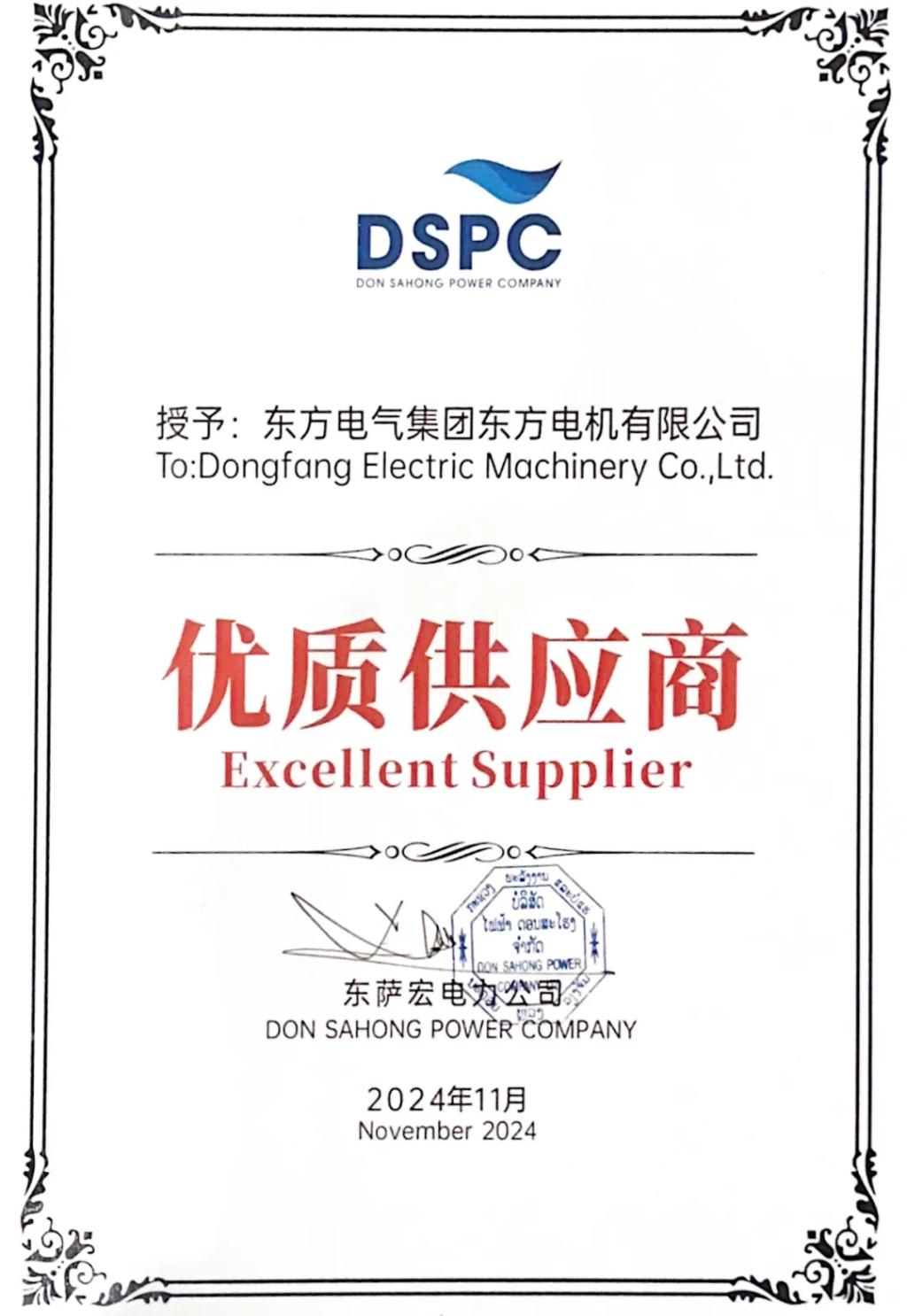 东萨宏电力公司向尊龙人生就是博ag电机颁发的“优质供应商”证书,是对机组运行优异的最好证明。