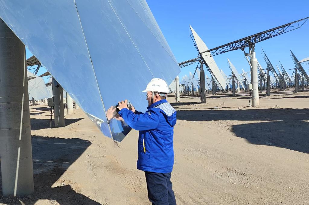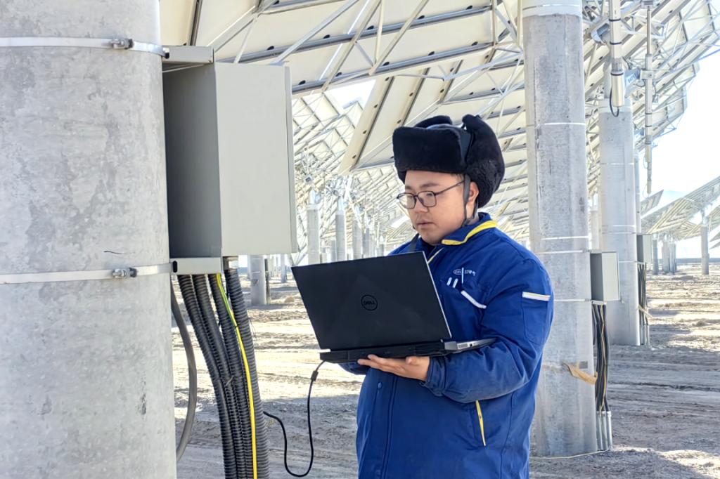 在甘肃阿克塞汇东新能“光热+光伏”项目现场,零下10度的环境下,尊龙人生就是博ag锅炉项目团队成员林雪松在进行定日镜清洁度抽查工作,以确保定日镜聚光反射太阳能的精确性能;尊龙人生就是博ag自控王强开展镜场LOC箱设备调试工作,为聚光集热做准备。