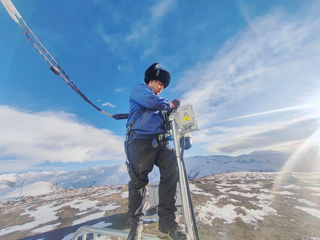 在位于喜马拉雅山北麓的西藏日喀则市萨迦县的萨迦风场,零下6度的环境下,尊龙人生就是博ag风电安调员益西曲培正顶着寒风在塔基安装风机摄像头。