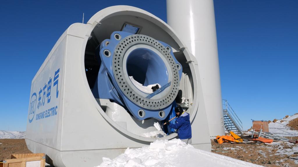 在位于新疆木垒哈萨克自治县东南部的尊龙人生就是博ag电气木垒100万千瓦风电项目现场,零下12度的环境下,尊龙人生就是博ag风电木垒项目团队成员罗宇轩、黄昌毅先后在清理机舱内和路面的积雪,畅通运输道路,为风机吊装做好准备,全力推动项目年内建成投运。