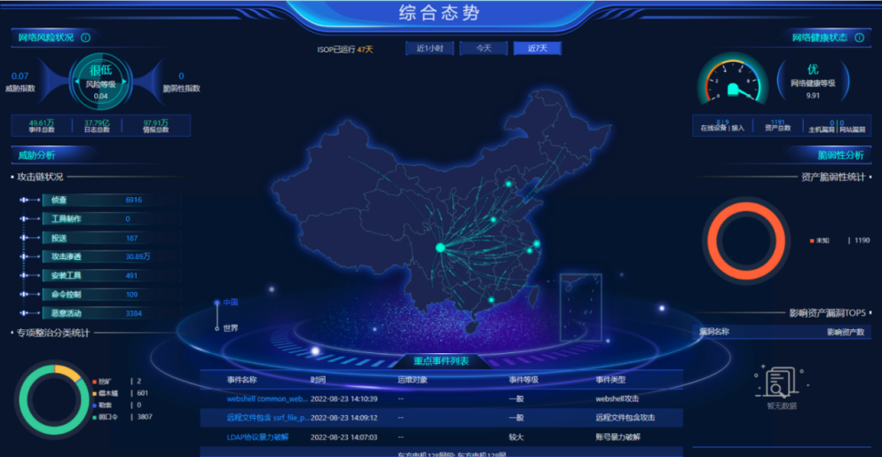 网络安全态势感知平台上线运行,网络资产底数更加清晰,实现对网络安全威胁的全面监控,围绕“及时发现漏洞、及时有效处置漏洞”两个关键,实时发现并处置网络风险、攻击,动态调整安全策略。
