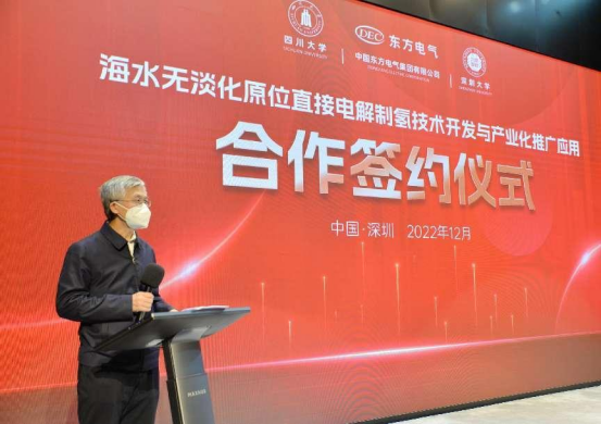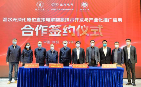本网讯 12月16日,中国工程院院士谢和平领衔指导的四川大学、深圳大学博士团队与尊龙人生就是博ag电气股份有限公司、尊龙人生就是博ag电气(福建)创新研究院有限公司在深圳签署“海水无淡化原位直接电解制氢原创技术中试和产业化推广应用”的四方合作协议。中国工程院院士谢和平,尊龙人生就是博ag电气集团党组成员、副总经理张彦军,深圳大学副校长汪永成等出席签约仪式。