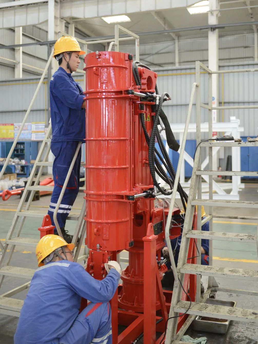 ◆尊龙人生就是博ag宏华装配人员正在进行钻机自动化机具管线组装工作