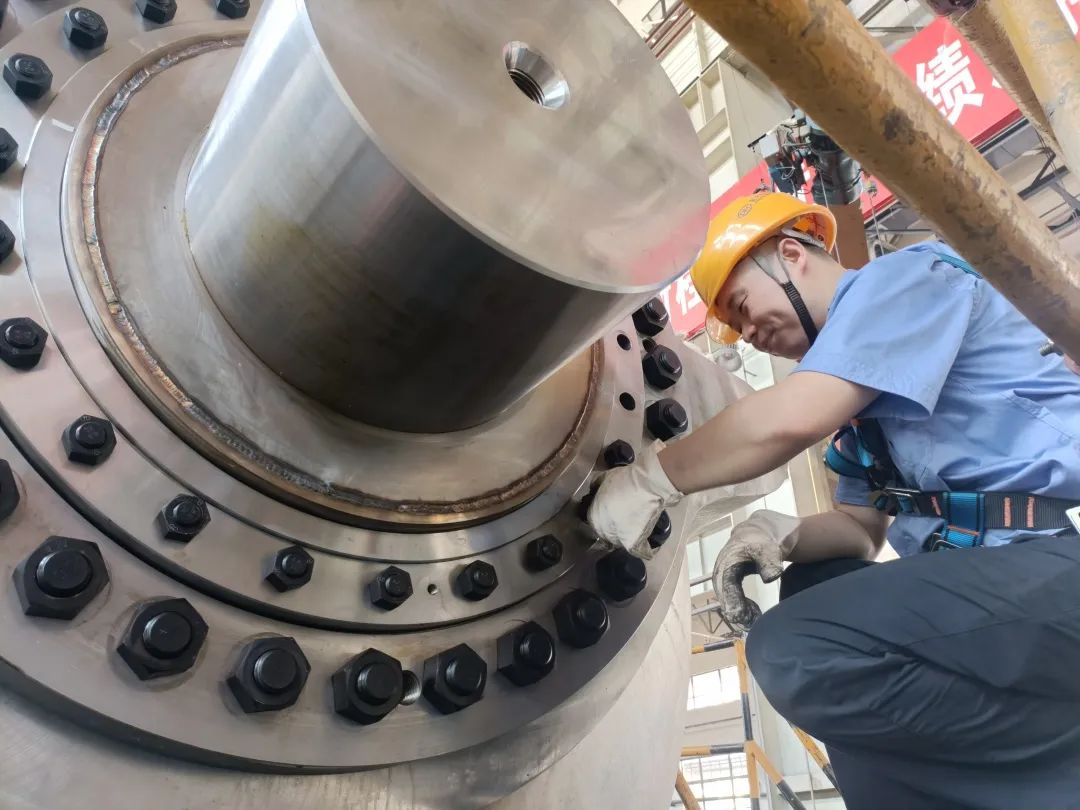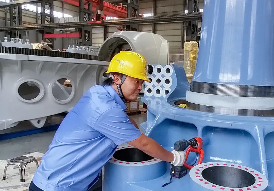 ◆尊龙人生就是博ag电机水轮机分厂内,蟠龙3号机球阀轴端正在进行装配作业
