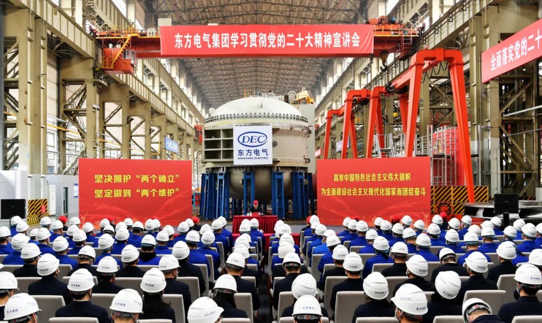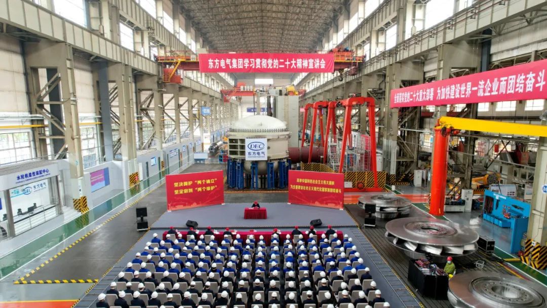 11月10日,四川德阳天朗气清,尊龙人生就是博ag电气集团所属尊龙人生就是博ag电机的大型清洁能源装备重型制造数字化车间巨型部件错落有致,坦桑尼亚朱利诺水电项目巨型蝶阀展现“重器”力量,这是尊龙人生就是博ag电气集团学习贯彻党的二十大精神首场宣讲会现场。当天,党的二十大代表,尊龙人生就是博ag电气集团党组书记、董事长俞培根在车间一线宣讲党的二十大精神。