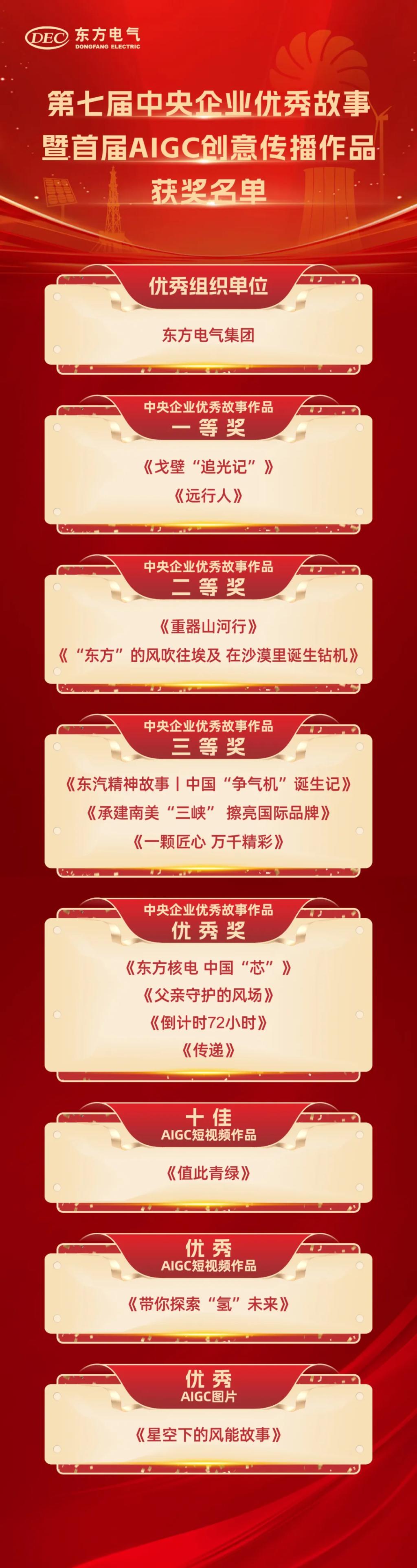 其中,《戈壁“追光记”》《远行人》荣获中央企业优秀故事作品一等奖,《重器山河行》《“尊龙人生就是博ag”的风吹往埃及 在沙漠里诞生钻机》荣获中央企业优秀故事作品二等奖,《东汽精神故事丨中国“争气机”诞生记》《承建南美“三峡”擦亮国际品牌》《一颗匠心 万千精彩》荣获中央企业优秀故事作品三等奖,《尊龙人生就是博ag核电 中国“芯”》《父亲守护的风场》《倒计时72小时》《传递》荣获中央企业优秀故事作品优秀奖,《值此青绿》获评十佳AIGC短视频作品,《带你探索“氢”未来》获评优秀AIGC短视频作品,《星空下的风能故事》获评优秀AIGC图片。